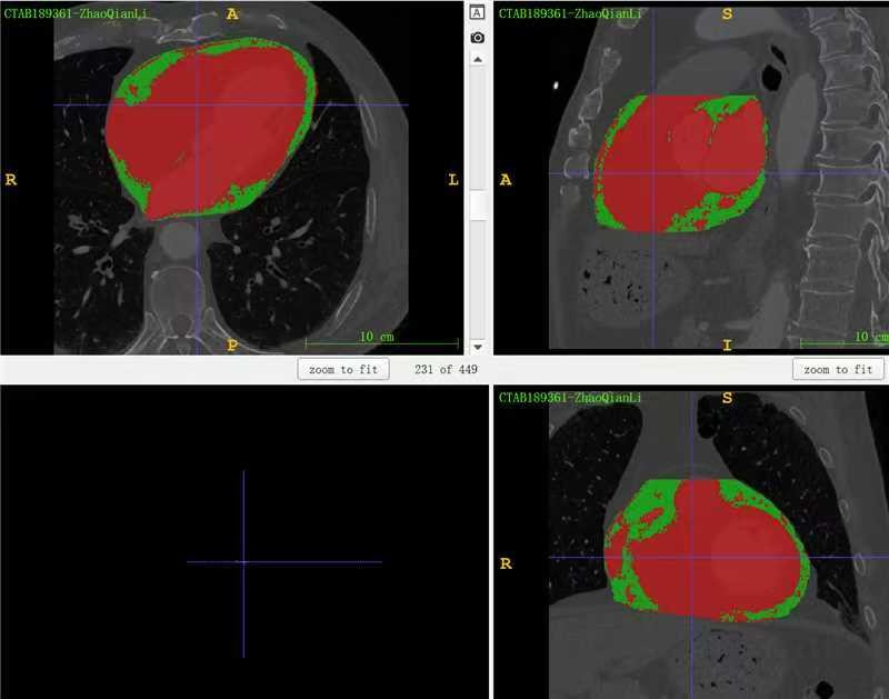 一共460例,由3名分别具有1年、5年、25年胸部放射诊断经验的住院医师、主任医师将每例患者的CCTA图像导入至 3D Slicer 5.2.0 软件,分别通过半自动方法,逐层勾画心包轮廓并通过-200HU~30HU范围阈值分割出CCTA全部脂肪密度区域,应用布尔运算提取出心包轮廓内的脂肪组织,医师人工复核确认心包脂肪区域轮廓符合客观情况;在心包边界不清的位置,以肺门胸膜反折、左心房后壁等结构作为参考,对于因成像时图像重建过滤器不同而导致的标准差过高的病例,阈值分割后增加人工复核一次,将心肌、血管等结构排除出勾画区域。在上述统一标准下完成勾画任务,勾画完成后,将原始CCTA和掩膜分别保存为三维NIfTI格式文件。为了减少勾画任务的信息偏倚干扰,3名参与勾画任务的医师事先均不告知研究目的、各CCTA病例患者的相关临床资料。