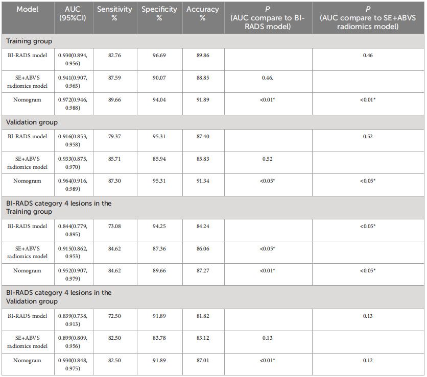 表3 BI-RADS模型、SE+ABVS放射学模型和诺莫图在每个组中的诊断参数。