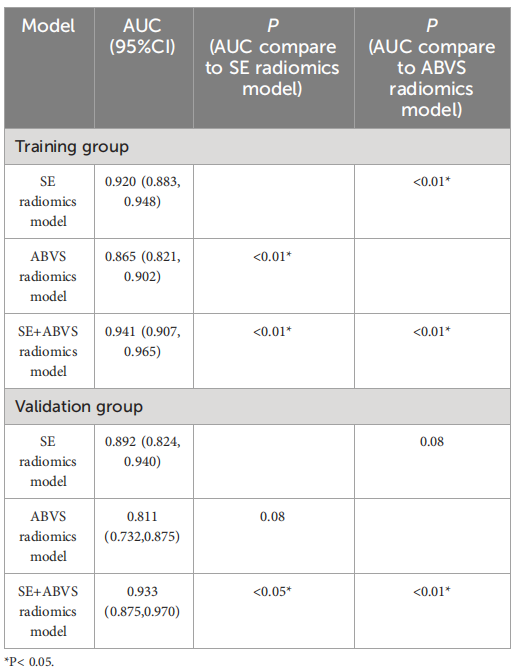 TABLE 3 The diagnostic parameters of the BI-RADS model, SE+ABVS radiomics model, and Nomogram in each group