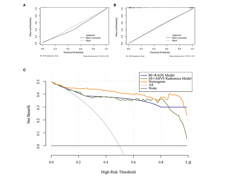 图7 诺莫图在训练组(A)和验证组(B)中的校准曲线。BI-RADS模型、SE+ABVS放射学模型和诺莫图在验证组中的决策分析曲线(C)。