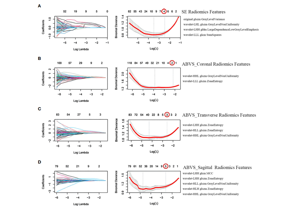 FIGURE 3 Screening of radiomics features. Selection of strain elastography (SE) radiomics features (A), automated breast volume scanner (ABVS) coronal plane radiomics features (B), ABVS transverse plane radiomics features ©, and ABVS sagittal plane radiomics features (D) using the least absolute