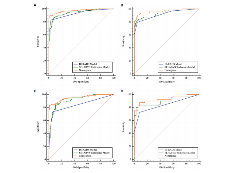 图6 在训练组(A)、验证组(B)、训练组中的BI-RADS类别4病变(C)和验证组中的BI-RADS类别4病变(D)中,展示了BI-RADS模型、SE+ABVS放射学模型和诺莫图的受试者工作特征曲线。