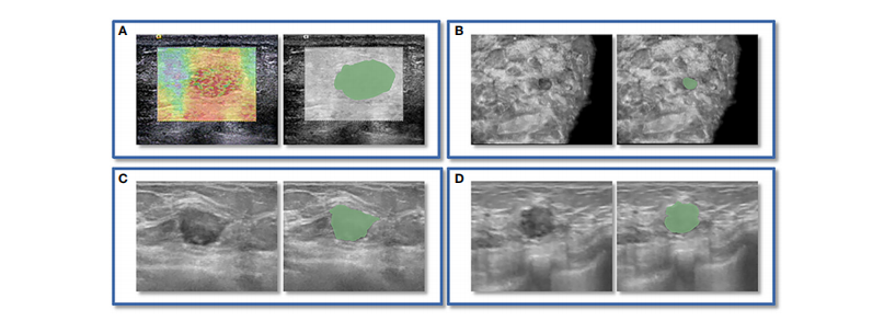 图2手动绘制感兴趣区域(ROI)的示例。这是一位41岁女性的左乳房上有一个约16×11×12mm的实质性低回声病变的应变弹性成像(SE)和自动乳腺体积扫描仪(ABVS)图像。该病变呈不规则形状,位置平行,边界清晰,边缘锐利,内部可见分散的微钙化,冠状位上没有明显的后方声明显改变或回缩,超声弹性评分为4,最终被分类为BI-RADS类别4a。病理检查确认为浸润性导管癌。ROI分割分别在SE图像(A)和ABVS冠状图像(B)上进行,沿病变边界绘制,然后将边缘均匀向外扩展3毫米以包围一些周围组织。ROI分割分别在ABVS横断面(C)和矢状面(D)图像上进行,对这两个视图上的病变轮廓和边界进行了精细细致的绘制