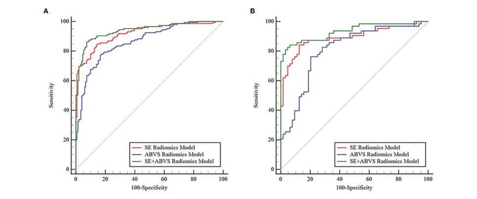 图4 在训练组(A)和验证组(B)中,各种放射学模型的受试者工作特征曲线。