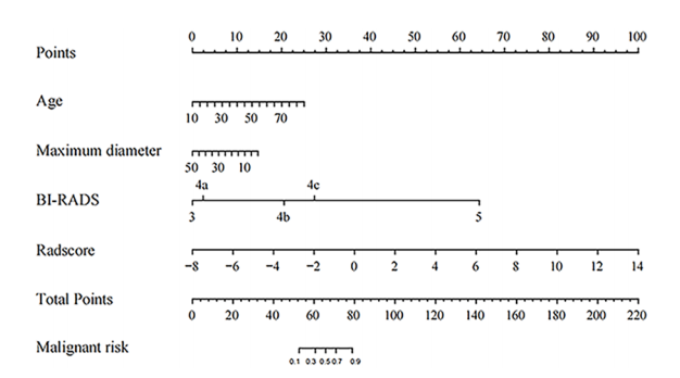 该诺莫图可以更有效地评估实质性低回声乳腺病变的恶性风险,因此,它可以作为临床诊断的新的高效工具。