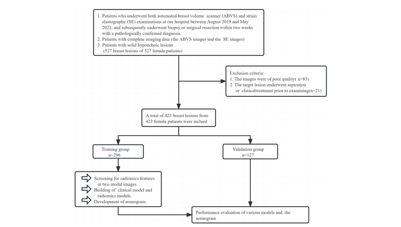 May 2022. They were assigned to the training (n=296) and validation (n=127) groups in a 7:3 ratio by generating random numbers. Radiomics features were extracted and screened from ABVS and SE images, followed by the calculation of the radiomics score (Radscore) based on these features. Subsequently, a nomogram was constructed through multivariate logistic regression to assess
